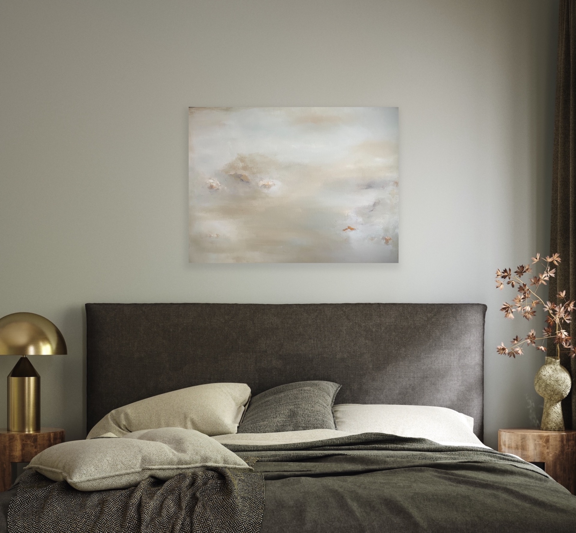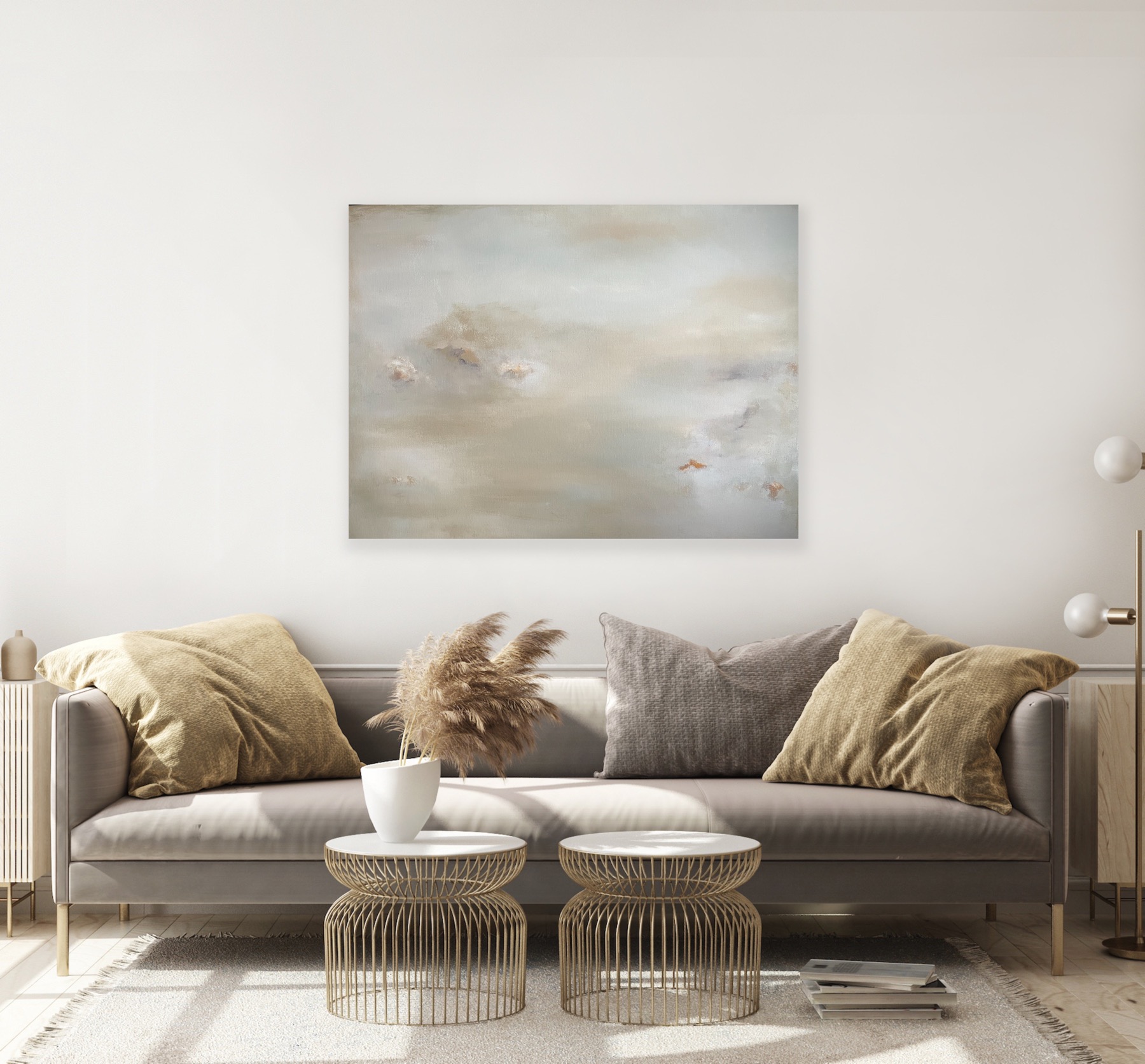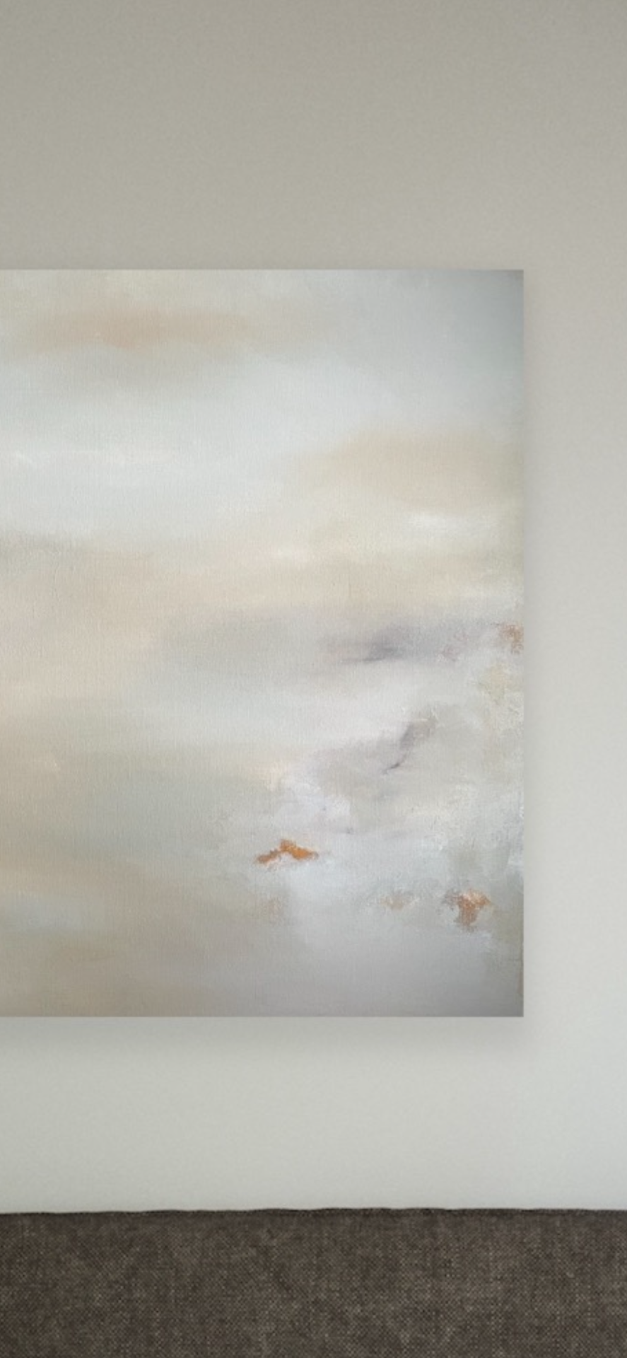 Maleriet er 90 cm x 70 cm bomullslerett, spennet opp på en blindramme i tre.
