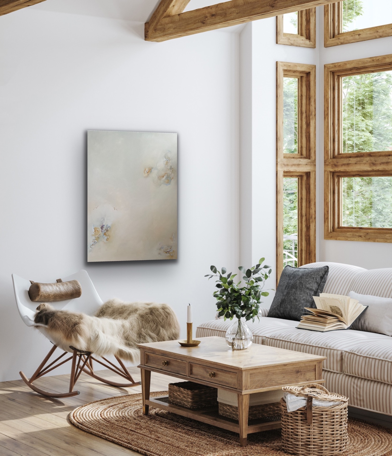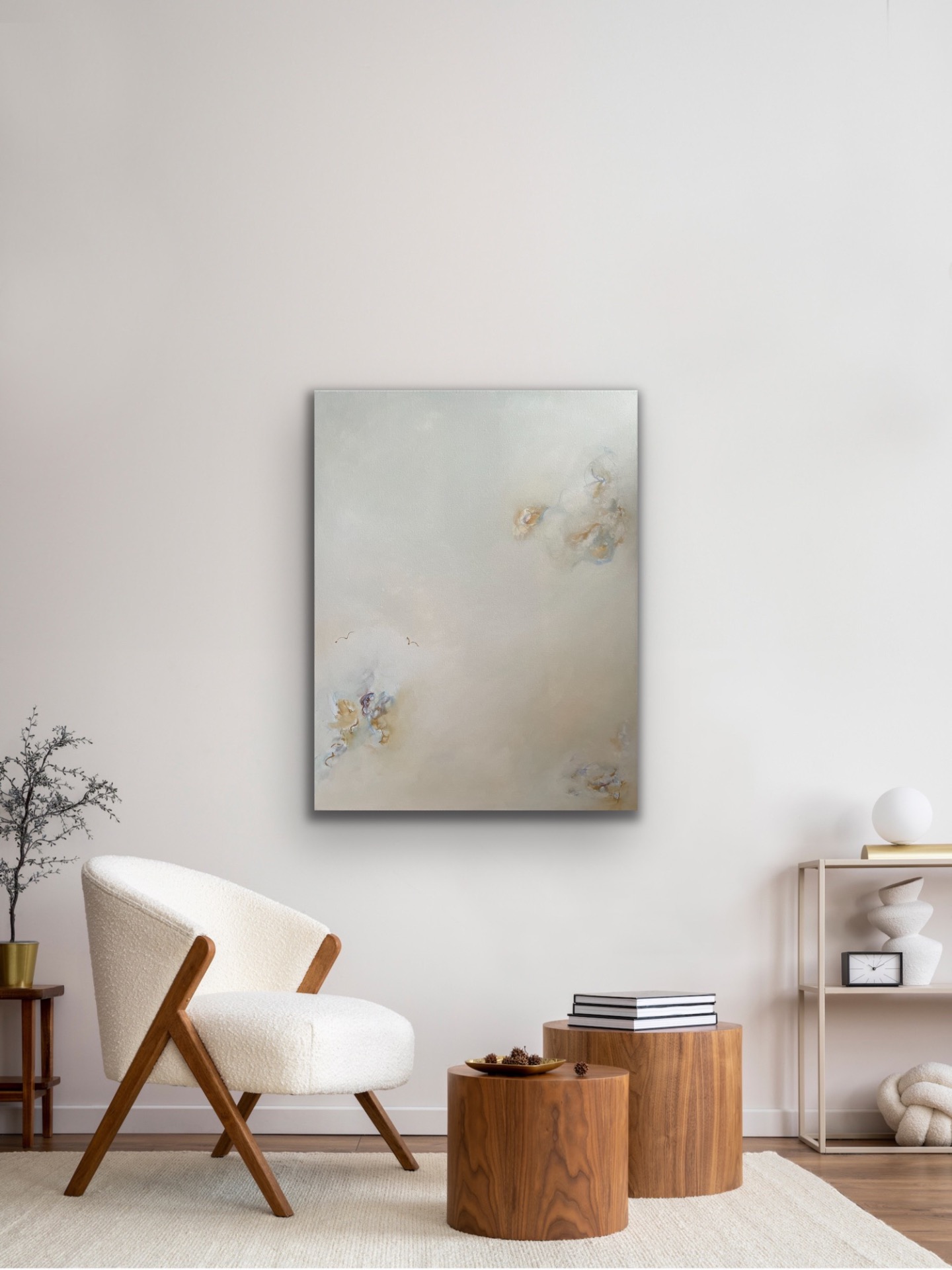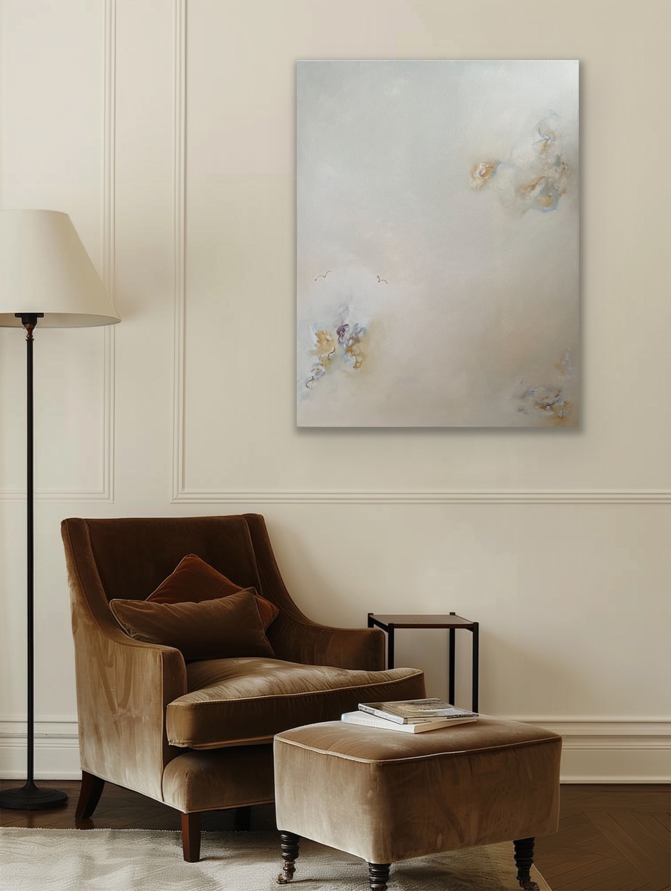 Maleriet er 90 cm x 70 cm bomullslerett, spennet opp på en blindramme i tre.