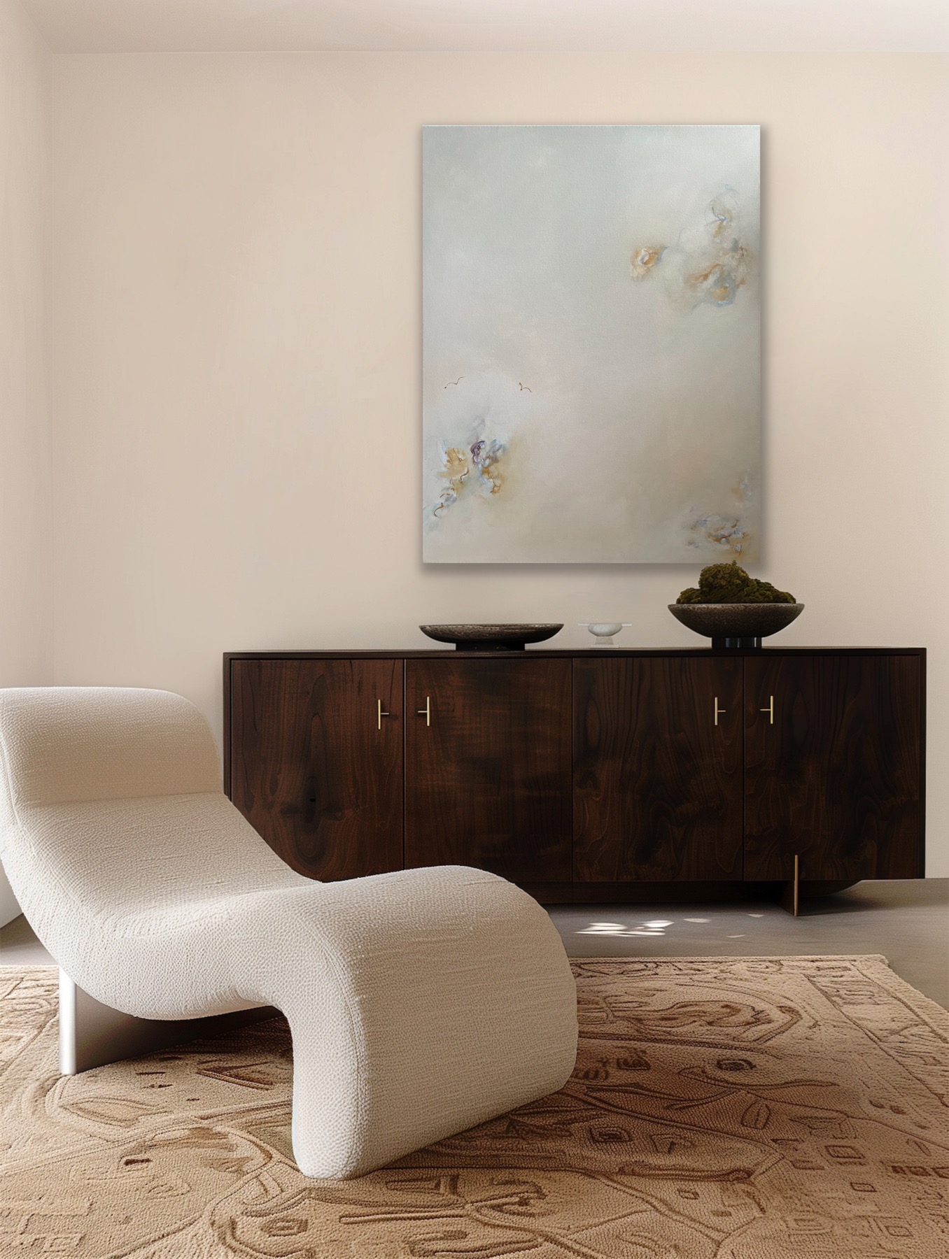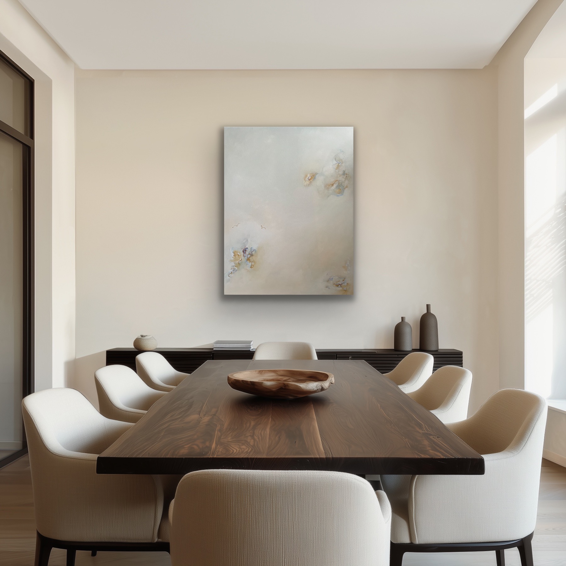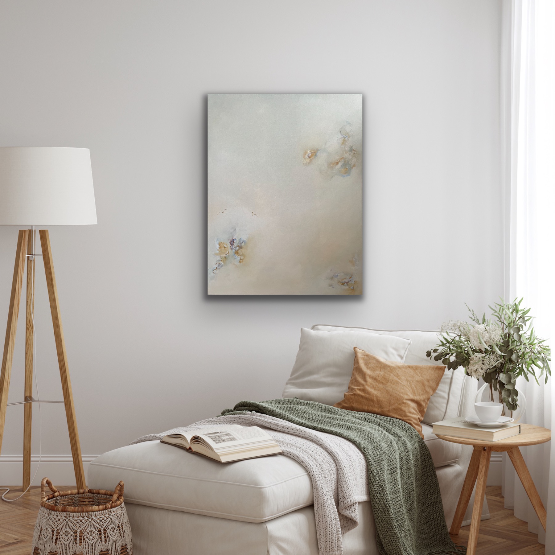 Maleriet er 90 cm x 70 cm bomullslerett, spennet opp på en blindramme i tre.